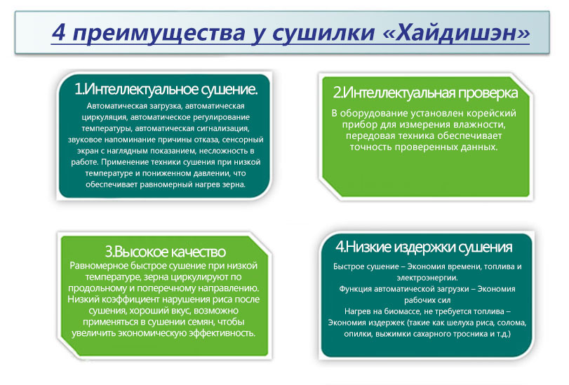 Зерносушилка имеет широкую сферу применения, удобна для сборки, возможно установить участок сушки в зависимость от количество атмосферных осадков, что обеспечивает требования к осадке и объему производства, низкий коэффициент трещины, возможно использоваться в сушении семян, чтобы увеличить экономическую эффективность